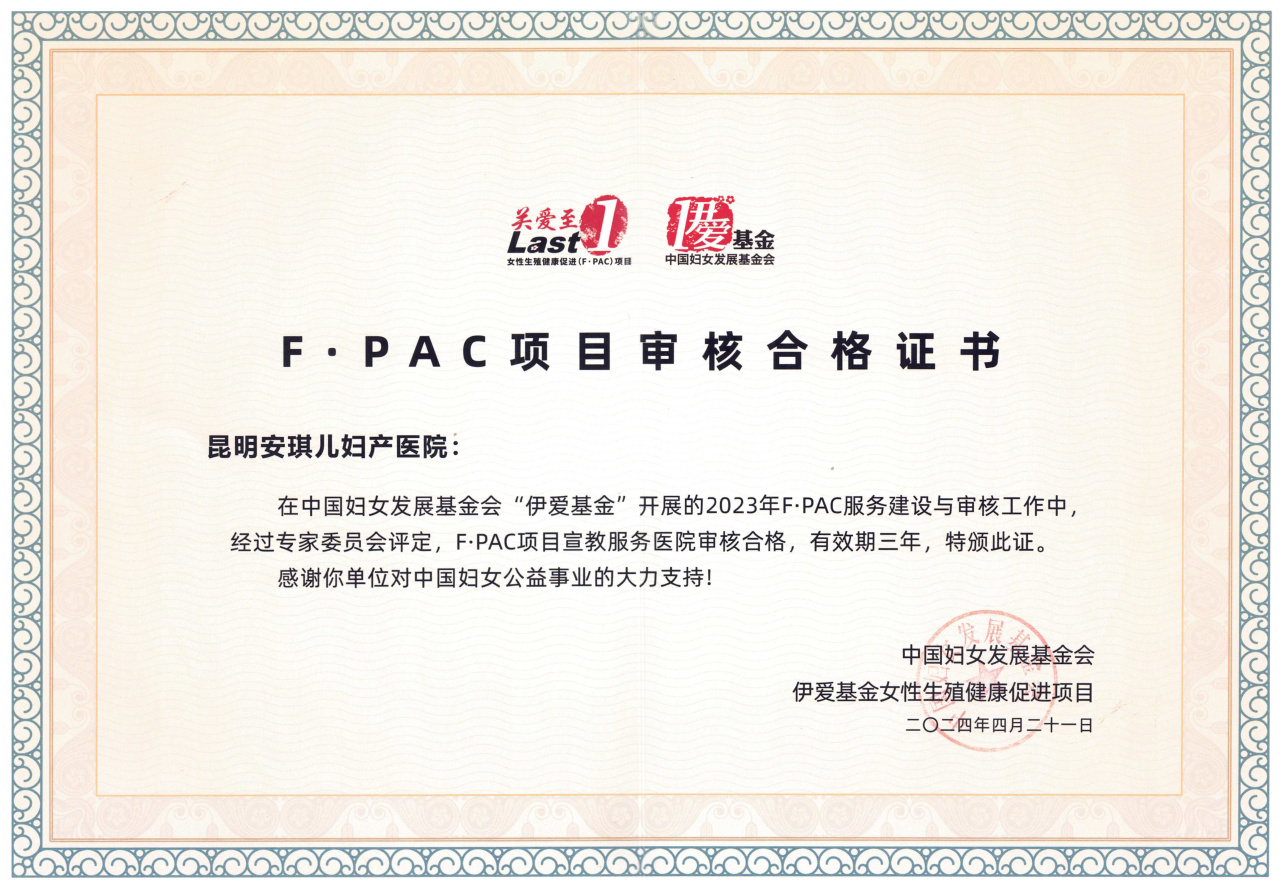 4月21日,在中国妇女发展基金会“伊爱基金”举办的女性生殖健康促进项目评审中,经过专家委员会评定,安琪儿医疗控股集团旗下昆明安琪儿妇产医院顺利通过f·pac项目宣教服务医院审核并获得f·pac项审核合格证书。