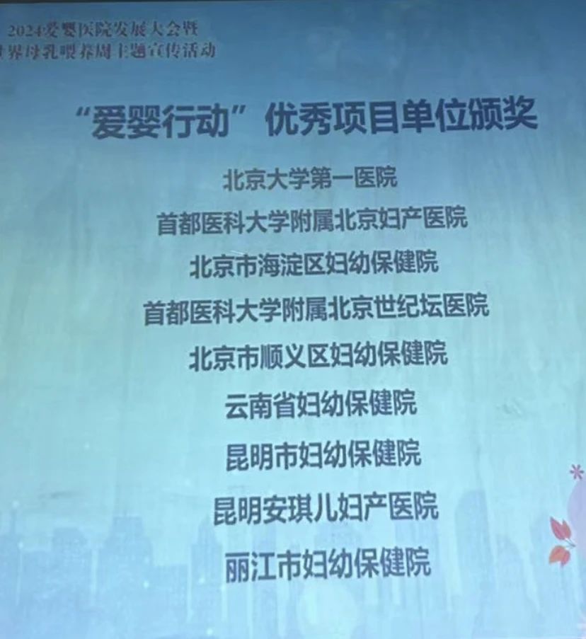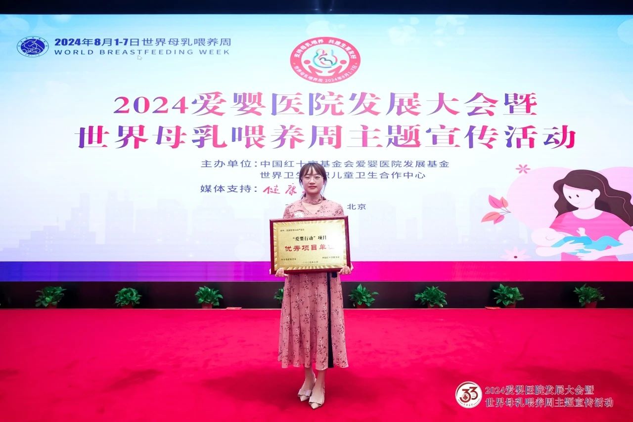 在第33个“世界母乳喂养周”来临之际,我院受邀且委派产科副护士长李朵代表昆明安琪儿妇产医院出席参加了由中国红十字基金会、世界卫生组织儿童卫生合作中心于7月27日在北京举办的“2024年爱婴医院发展大会暨世界母乳喂养周”大会并上台领奖接受表彰。
