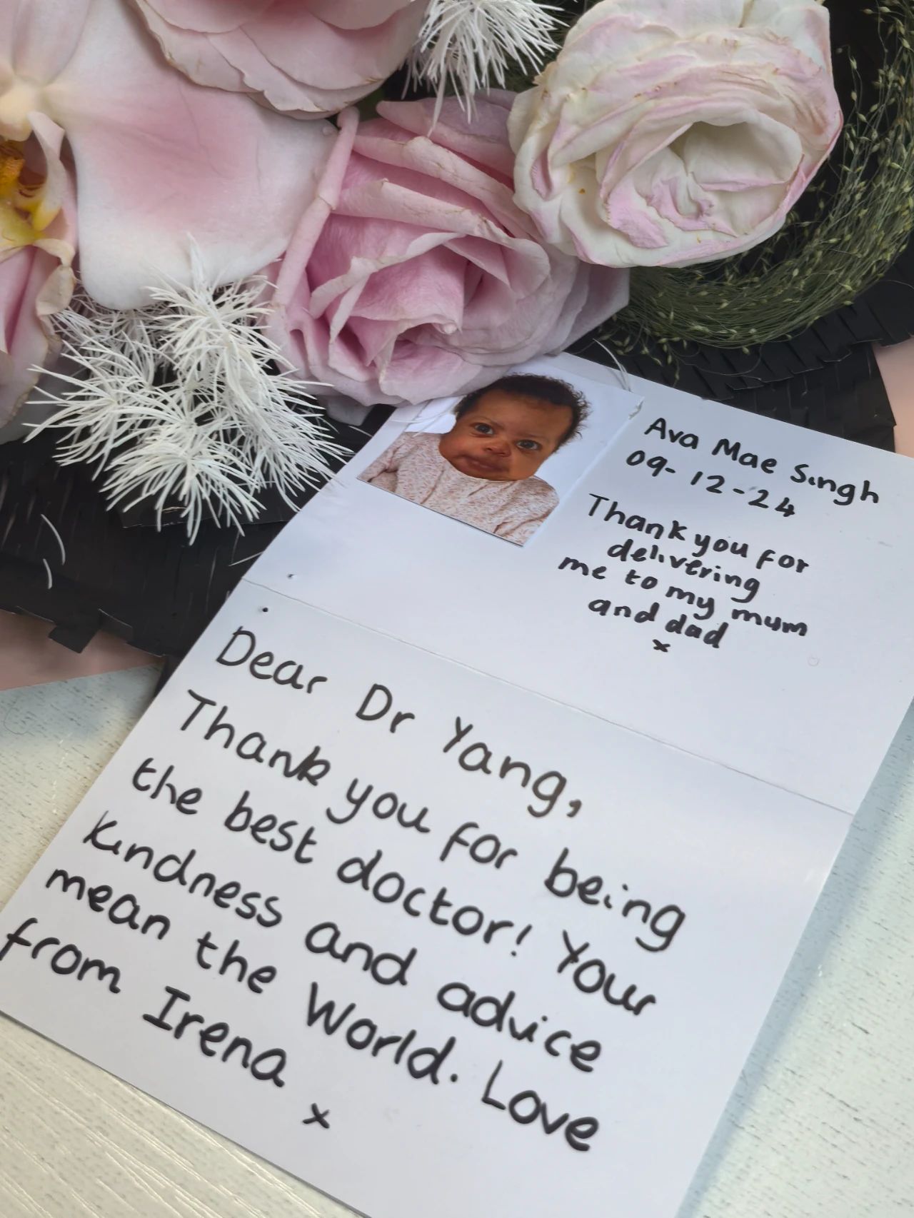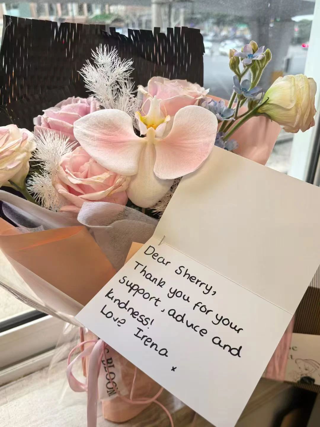 一个月后irena来院产后复查,送来了鲜花和手写了卡片致谢。她非常感谢当晚向她提供帮助的医护人员,特别致谢安琪儿国际门诊杨博及助理徐女士一直陪伴和照顾。