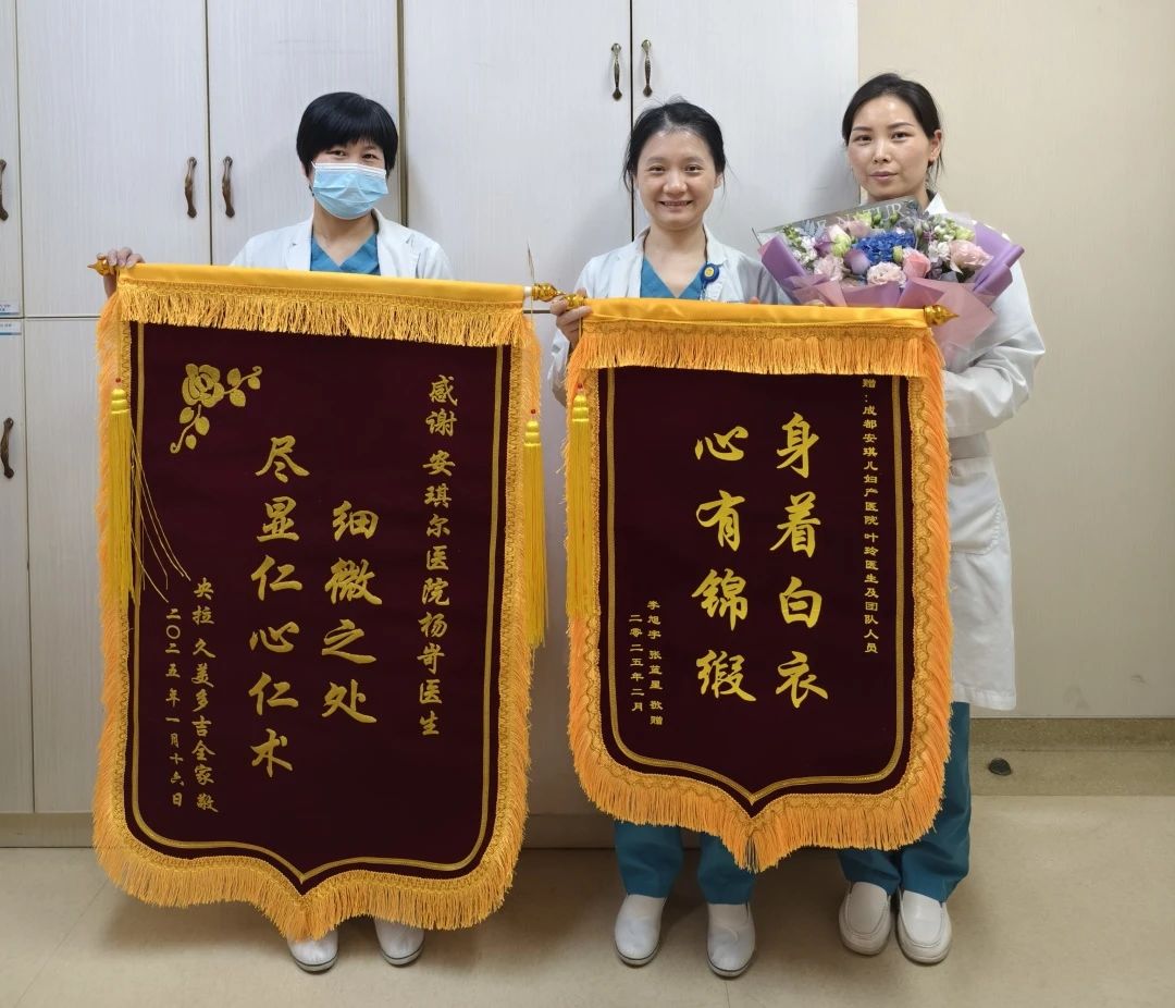 产科的张莉医生近期也收到了来自忠实粉丝客户的特别礼物——哈达、锦旗和鲜花。这位宝妈在安琪儿生产了四个宝宝,每一次孕产过程中,张莉医生都给予了她专业的指导和体贴的照顾。这份信任与认可,不仅是对张莉医生个人医术和职业操守的高度评价,更是对我院产科团队整体实力和服务水平的充分肯定。这份锦旗和鲜花,是对所有医护人员辛勤付出的最好回报。