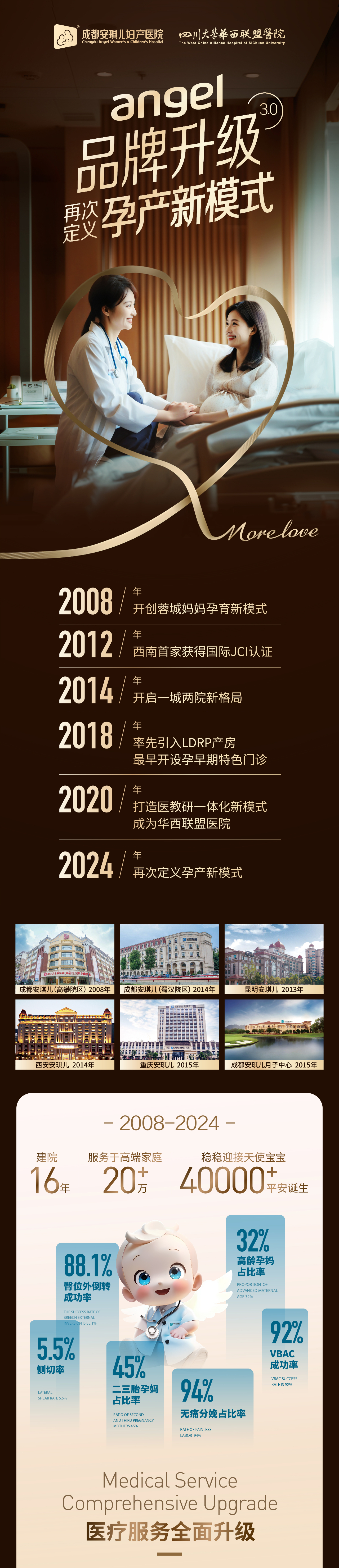 2024年是安琪儿品牌升级3.0时代,16年来,安琪儿开创了蓉城妈妈孕育新模式,多年来,一直持续迭代更新,创造了无数个“首次”,无数个新格局;今年,安琪儿品牌全面升级,将再次定义孕产新模式,持续提升业务水平,强化专业团队,优化服务内容,守护更多孕产妇全生命周期健康管理。