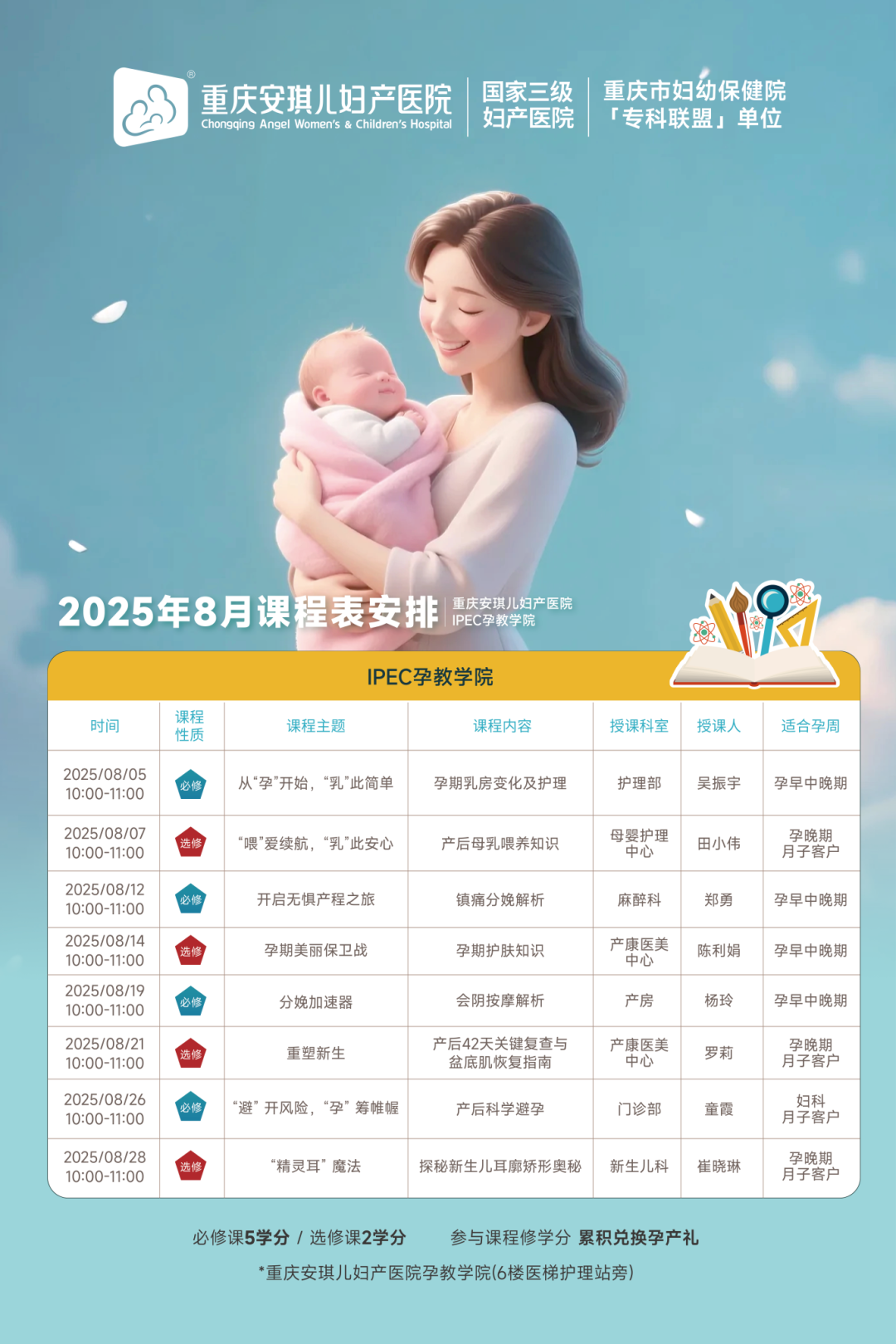 母乳喂养周活动只是精彩序幕!安琪儿孕教学院8月课程持续放送,将陆续推出覆盖孕、产、育全周期的精品课程,助力准爸准妈系统学习,从容迎接每一阶段!