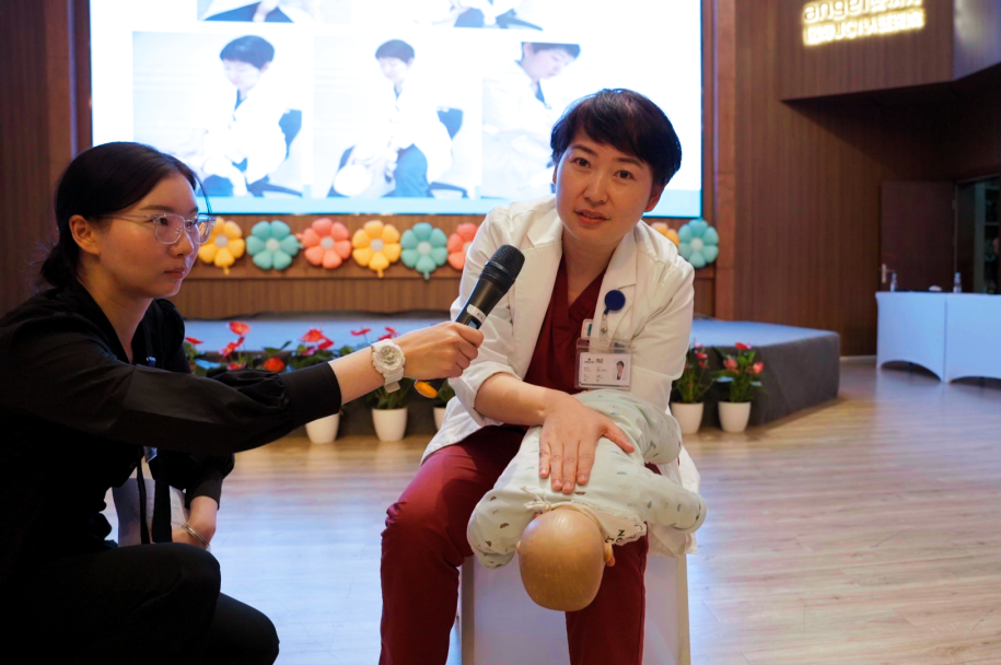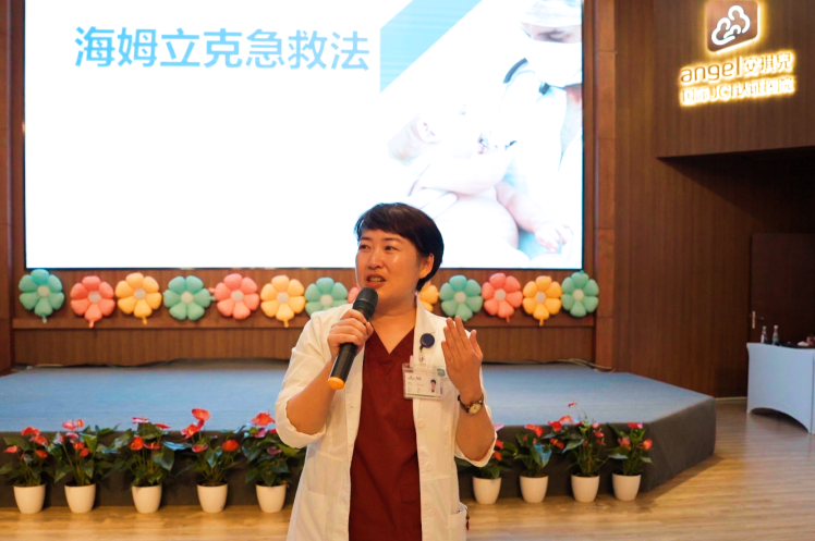 活动现场还邀请到了儿保科张平主任。张平主任提到:异物卡喉是儿童常见的日常安全隐患,为提高家长与患儿在紧急情况下自救的意识和能力,张平主任在现场为家长们带来一节干货满满的海姆立克急救法小课堂。