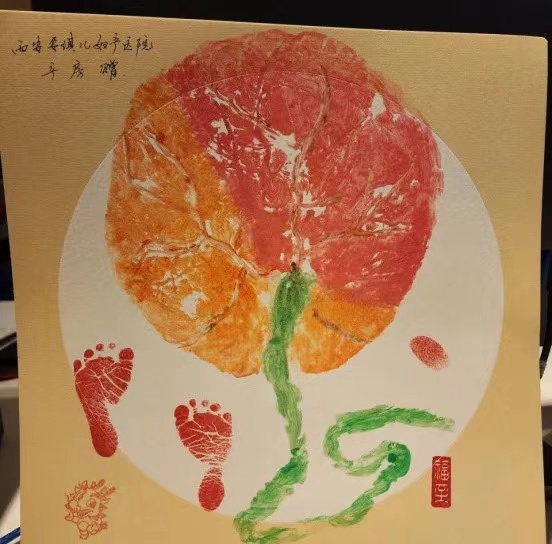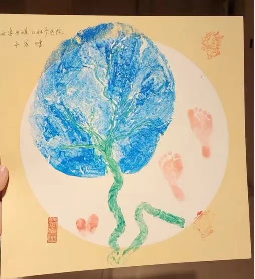 当小生命顺利诞生,胎盘和脐带也完成了它们的使命。产房的助产士们以胎盘为笔、手足为印,为产妇们精心创作“私人定制”的胎盘拓印画,并免费赠予产妇及新生儿。