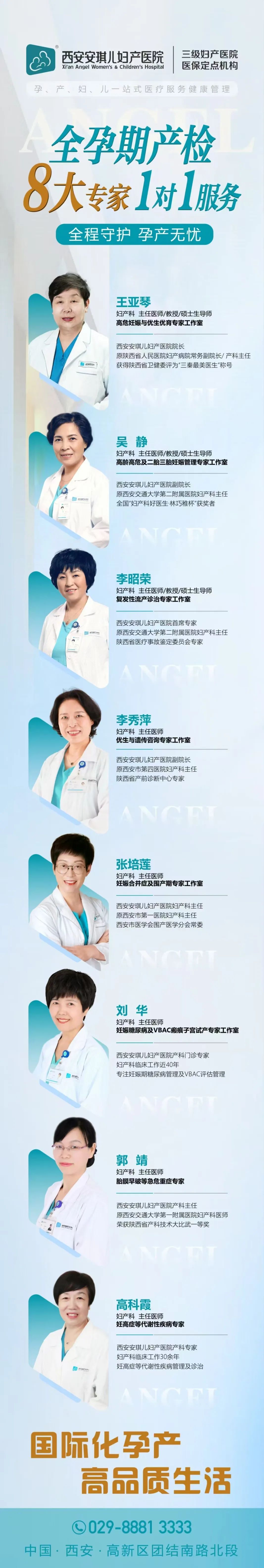 产科拥有一支专业技术力量过硬的专家团队,汇聚省内众多知名三甲医院硕博专家,有原陕西省人民医院妇产病院常务副院长、产科主任王亚琴院长,原西安交通大学第二附属医院妇产科主任、全国“妇产科好医生·林巧稚杯”过奖者吴静教授,原西安交通大学第二附属医院妇产科主任、安琪儿首席专家李昭荣教授,原西安市第四医院妇产科主任、西安安琪儿副院长李秀萍主任,原西安市第一医院妇产科主任张培莲主任,临床经验近40年的刘华主任,原西安交通大学第一附属医院郭靖主任,产科专家高科霞主任等8大权威专家领衔亲诊,全程守护孕产安全。